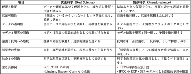 科学は「疑うことを恐れない営み」であり、異なる見解が存在すること自体が、科学の健全性を保つ条件である。特に気候変動のようなテーマでは、「科学のふりをした信念体系」に注意が必要といえる。
