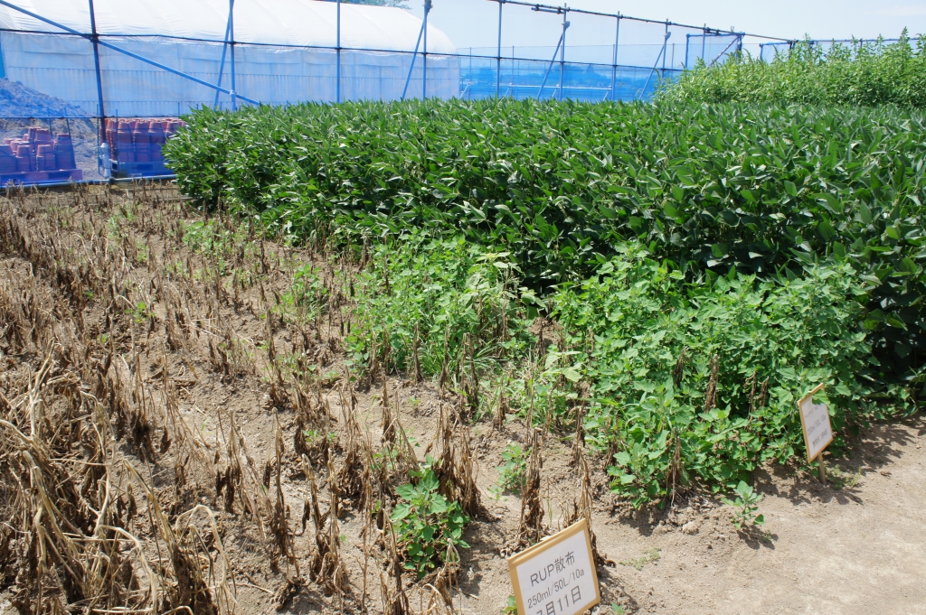 (写真5)遺伝子組換えではない普通の大豆にグリホサート除草剤がかかって枯れている
