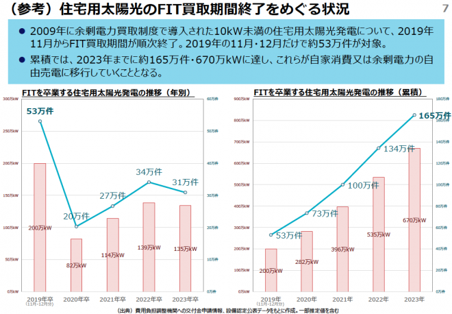と、いきなり循環論法のようなおかしな言い回しになってしまったが、簡単に言ってしまえば、そもそも「住宅太陽光発電の2019年問題」とは、「固定価格買取制度(FIT)の買取期間が終了した住宅太陽光発電システムから発電される電気をどのように有効に使うか?」という問題である。FIT制度の前身となる住宅用太陽光発電システムの余剰電力買取制度が創設されたのは2009年のことだった。そこから起算して買取期間の10年が初めて終了する事例が生じるのが2019年となるので、この問題が「2019年問題」と呼ばれるようになったわけである。