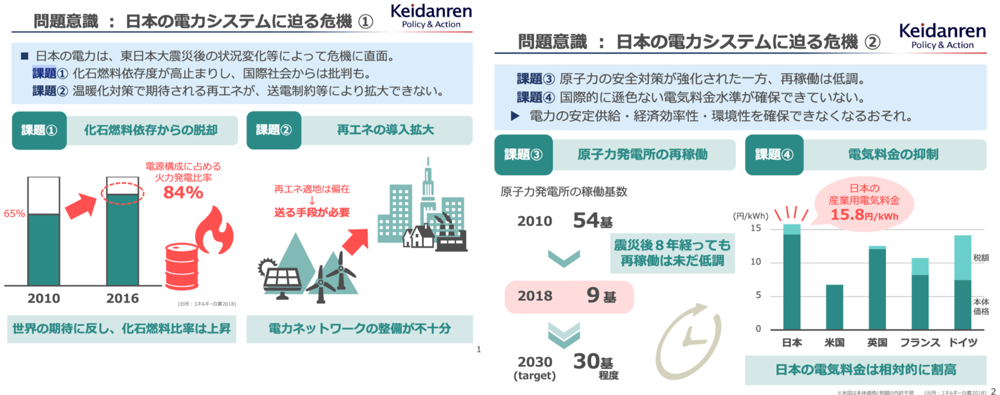 では、経団連が電力システムにどのような危機感を持っているかというと、具体的には以下の四つの点が挙げられている。
