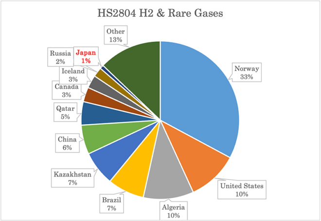 さて、この高い税率の矢面に立つのは日本ではない。EUの輸入量全体を100%として、それに占める輸出国のシェアを、以下で6枚の図に示す。図は順に、鉄鋼、アルミ、セメント、窒素肥料、水素及び希ガス、電力である。