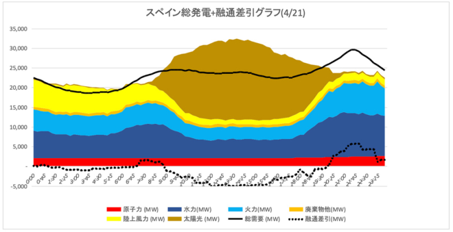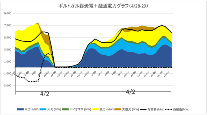 12:00に5,747MWから3,285MWに、13:00には94MWにまで減少しています。 - スペインとの連系の断絶