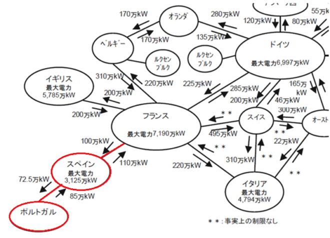 また、ポルトガル〜スペイン間も複数の連系線で接続されていますが、全体の構成は図2のとおりです。なお、スペインはモロッコとも連系していますが、その容量が小さいため、図では省略しています。