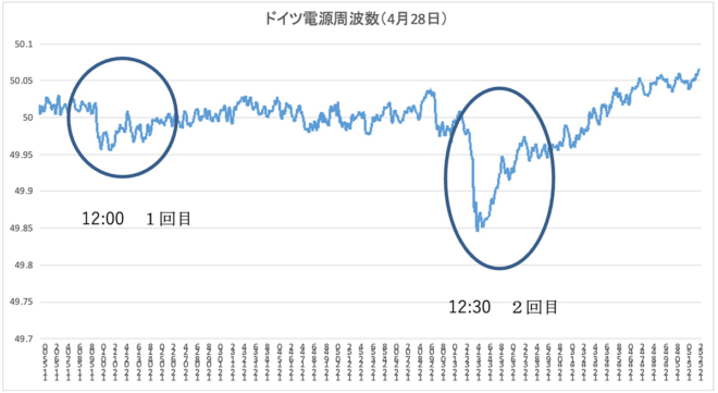 12:00頃に、まずポルトガル国内で約5,380MWの電源脱落が発生し、これによって欧州全体の周波数が0.04Hz低下しました。その約30分後の12:32頃、スペイン国内で24,000MW規模の電源脱落が発生し、周波数はさらに0.16Hz低下しました。その後、10分程度で周波数は回復しました。