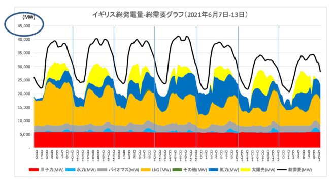 図6 イギリスの総発電量と総需要のグラフ(2021年6月7~11日)