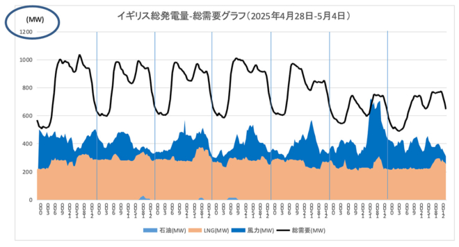 図7 イギリスの総発電量と総需要のグラフ(2025年4月28日~5月4日)