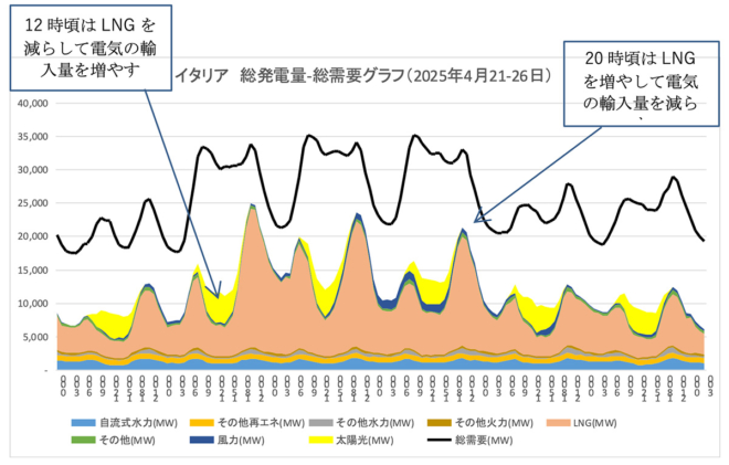 図3 イタリアの総発電量と総需要のグラフ