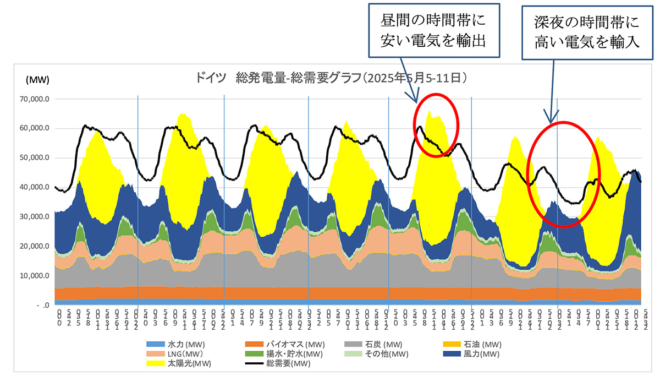 注目すべきは、日中の12時前後、電力価格が比較的安い時間帯に電力を輸出し、深夜の電力価格が高い時間帯に電力を輸入している点です。これにより、結果的に国富が国外へ流出している状況が読み取れます。