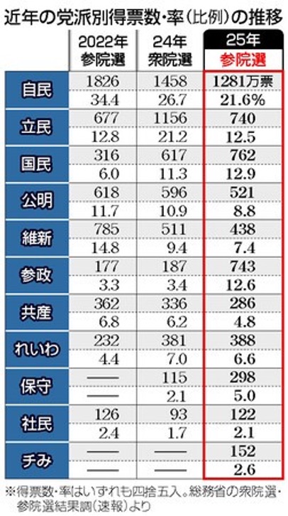 強かった安倍政治への失望が参政等への票を伸ばしたようだが、本質的ではない。一時的な退避にすぎない・・・行き場がなくたまたま漂着しただけである。