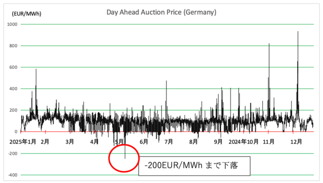 図1は、2024年10月から2025年9月までの1年間におけるドイツの電力市場価格の推移を示している。価格はおおむね150EUR/MWh程度で推移しているが、3月から9月にかけては時折マイナス価格が発生していることが分かる。