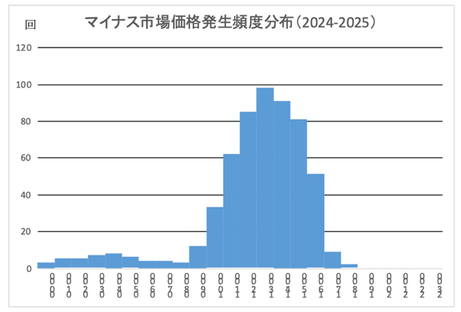 電力の輸出単価は市場での入札によって決まるため、電力が余剰となり売り札が過剰になると、約定価格がマイナスになることもしばしばある。