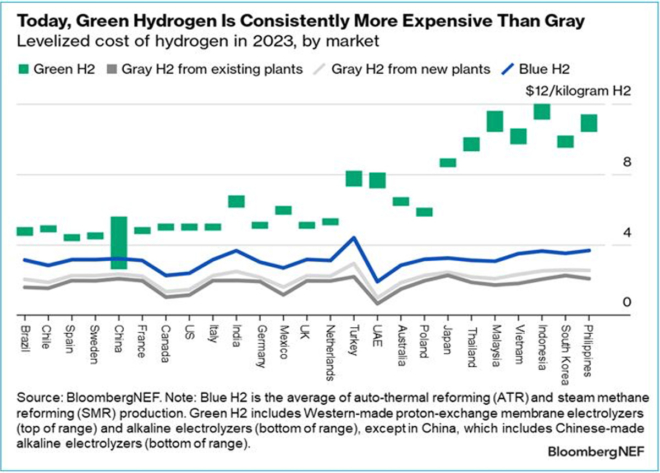 2023年時点において、グリーン水素は世界中のどの市場でも、グレー水素より高コストであることが示されている。技術や政策の違いを超えて、物理とコスト構造が結果を支配している。