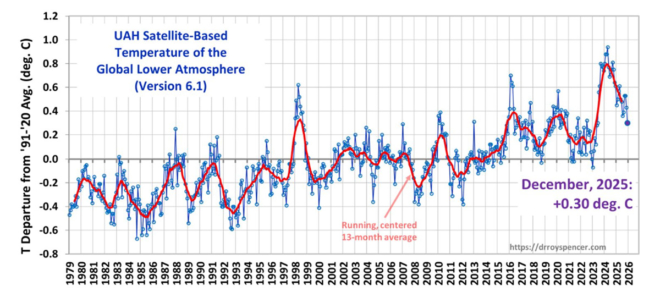 1991-2020年の平均に対する差分。2025年12月の値は+0.30℃であった。赤い線は前後13か月の平均。