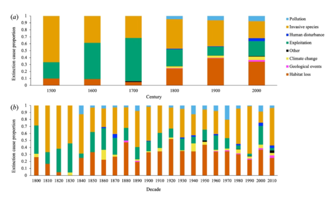 論文にある下図は、絶滅原因の変遷を時系列で示したものである。上半分の(a)は1500年以来、100年ごとに見たものである。下半分の(b)は、1800年以降を10年ごとに見たものである。