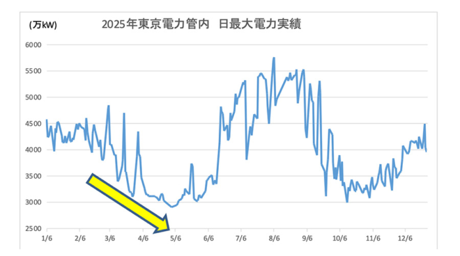 3月から6月にかけては、暖房も冷房も必要としないため、年間を通じて電力消費が最も少なくなる期間である。需要が急増するのは6月中旬の梅雨明け以降であり、そこから9月下旬まで高需要期が続く。