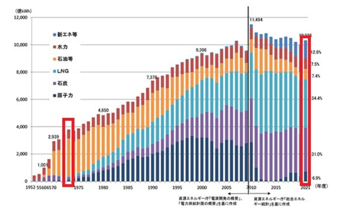 図1は、日本の発電電力量と発電燃料の推移である。赤枠部分に注目してほしい。1975年当時は石油で全体の約70%の電力を賄っていた。しかし、2021年現在では石油は約7%、LNGでも約34%にとどまっている。