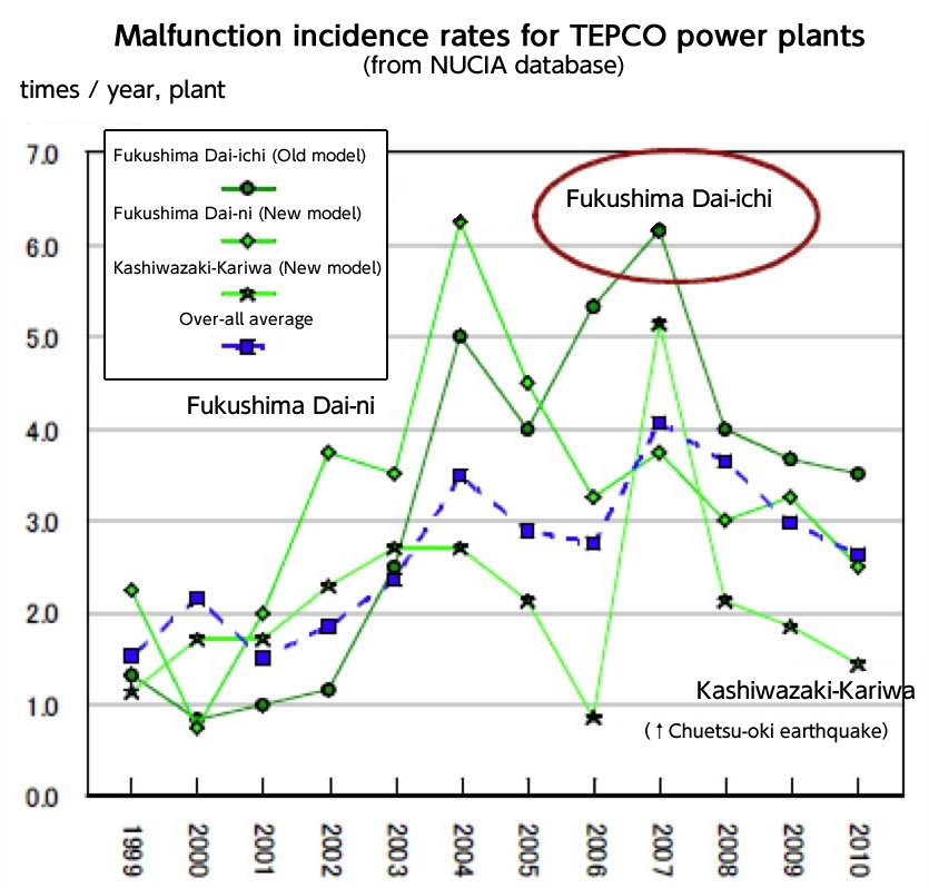 A comparison of malfunction incidence rates by reactor age and model between 1999 and 2010 in the database of the open library for nuclear power facilities (NUCIA) reveals that old-model boiling water reactors (BWR), such as Fukushima Dai-Ichi that sustained the accident, have recorded extremely high occurrences of malfunction incidence rates.